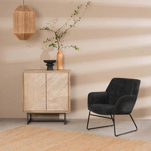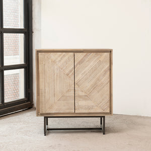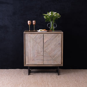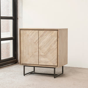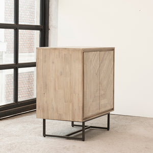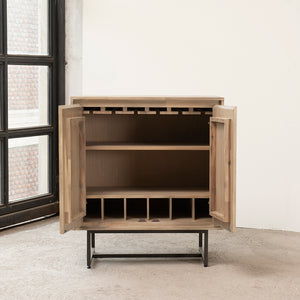 Material:Madera de Acacia, con acabado desgastado natural color arena. Incluye cava y copero.Base de metal negra. 2 puertas con bisagras de cierre suave.
