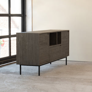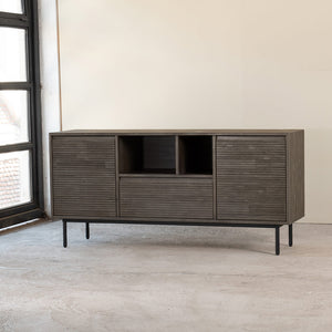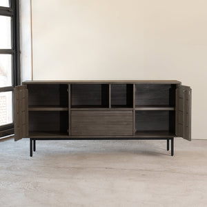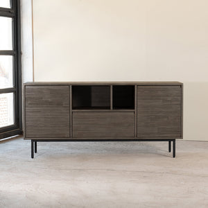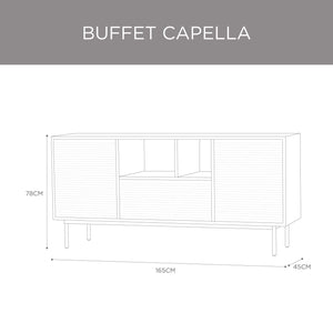 El Buffet Capella destaca por su estilo sobrio y contemporáneo, ideal para espacios que buscan elegancia funcional. Fabricado en madera sólida de acacia, ofrece dos puertas frontales, un cajón central y repisas interiores para mantener todo en orden. Su base metálica negra con acabado de electropintura aporta firmeza y contraste moderno. Una pieza versátil que combina diseño limpio, calidez natural y organización con carácter.