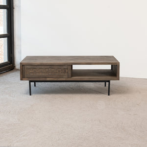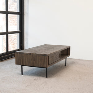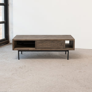 La Mesa de Centro Belize aporta carácter y funcionalidad a tu espacio. Fabricada en madera sólida de acacia, cuenta con un cajón frontal y una puerta corredera que ocultan lo esencial con diseño, además de un práctico compartimiento bajo la cubierta. Su base metálica con patas delgadas en negro con electropintura ofrece estabilidad y un look contemporáneo. Ideal para quienes buscan calidez natural con un diseño moderno y versátil.