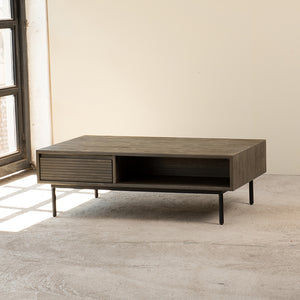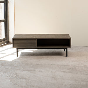 Fabricada en madera sólida de acacia, cuenta con un cajón frontal de suave deslizamiento gracias a su corredera telescópica, además de un práctico compartimiento abierto para mantener el orden. Su base metálica con acabado en pintura electrostática negra aporta firmeza y un aire moderno.