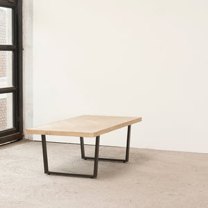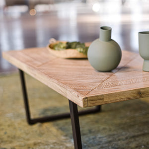 Material: Madera de acacia, con acabado desgastado natural color arena. Base de metal con electropintura negra.