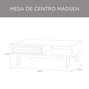 La Mesa de Centro Madsen destaca por su diseño limpio y funcional. Hecha 100% en madera sólida de acacia, cuenta con un cajón frontal con corredera telescópica y un práctico compartimiento abierto bajo la cubierta. Sus líneas escandinavas y patas inclinadas aportan calidez y carácter a tu living, convirtiéndola en el complemento ideal para un espacio acogedor y moderno.
