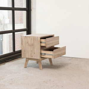 El Velador Madsen es la fusión perfecta entre diseño escandinavo y funcionalidad. Fabricado en madera sólida de acacia, cuenta con dos cajones de suave deslizamiento gracias a sus correderas telescópicas. Ideal para acompañar tu respaldo, ofrece el espacio justo para organizar con un toque cálido y natural que transforma tu dormitorio.