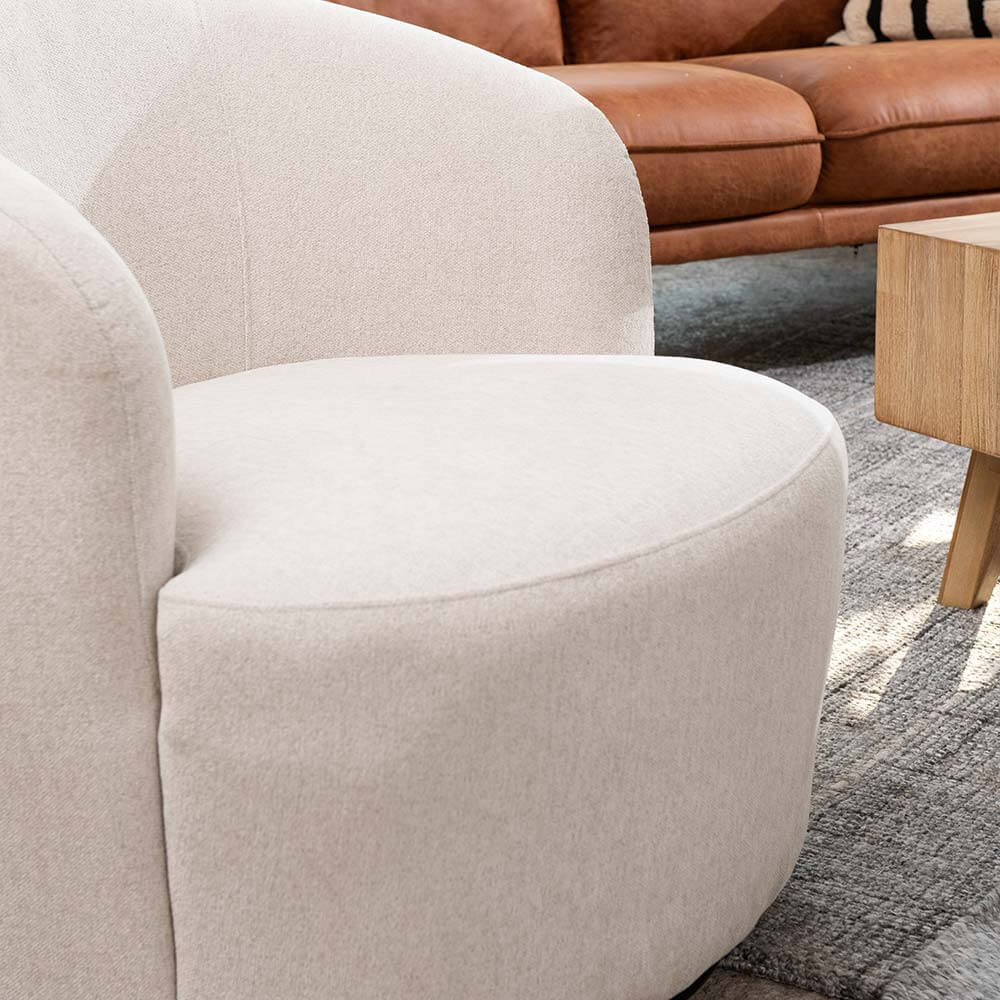 La Poltrona Caprice aporta estilo a tus espacios de relajo. Su base giratoria te brinda libertad de movimiento, mientras que la estructura metálica y los resortes nosag aseguran soporte y durabilidad. Tapizada en tela chenille, combina confort envolvente con diseño moderno. El toque ideal para tus momentos de pausa.