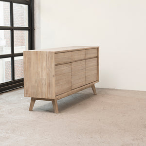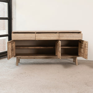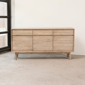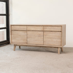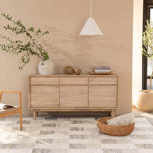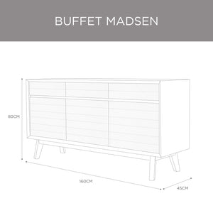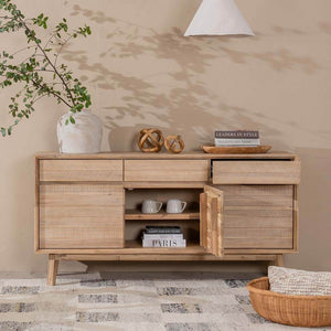 El Buffet Madsen combina funcionalidad y calidez en un diseño moderno. Fabricado en madera sólida de acacia, ofrece tres puertas con repisas interiores y tres cajones superiores con correderas telescópicas que deslizan suavemente. Ideal para quienes buscan organización con estilo natural, es la pieza perfecta para realzar tu comedor o sala.