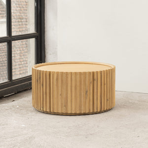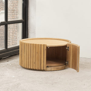 La Mesa de Centro Corfu es una pieza que combina diseño escultural y funcionalidad inteligente. De forma circular y fabricada 100% en madera sólida de acacia, cuenta con una puerta abatible que da acceso a un práctico compartimiento interior, ideal para mantener tu espacio organizado. Su cubierta con borde realza su estética envolvente. Perfecta para crear un punto focal natural y moderno en tu living.
