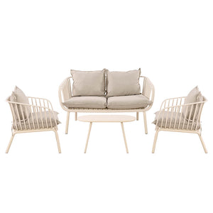 Redefine el estilo y la comodidad en tu terraza con el Set Terraza Astratto 4 Piezas. Incluye un elegante sofá, dos sillones y una mesa, todos diseñados en polipropileno y metal, combinando ligereza y resistencia. Los 8 cojines añaden un toque de confort y sofisticación. Disfruta de un espacio exterior que fusiona diseño contemporáneo y durabilidad para tus momentos de relax al aire libre.
