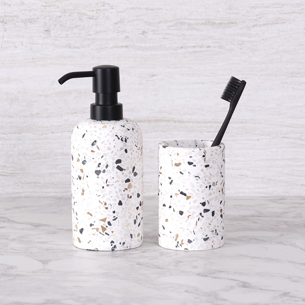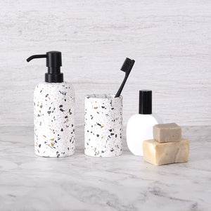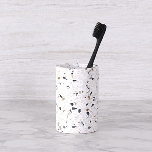 Nuestro Vaso Terrazo Molise para cepillos se integra perfectamente en tu baño, aportando sencillez y estilo. Una adición discreta que eleva la decoración con su diseño armonioso y funcionalidad impecable.