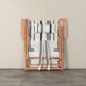 Material: Estructura de madera de eucalipto. Tela exterior repelente al agua (100% poliéster).