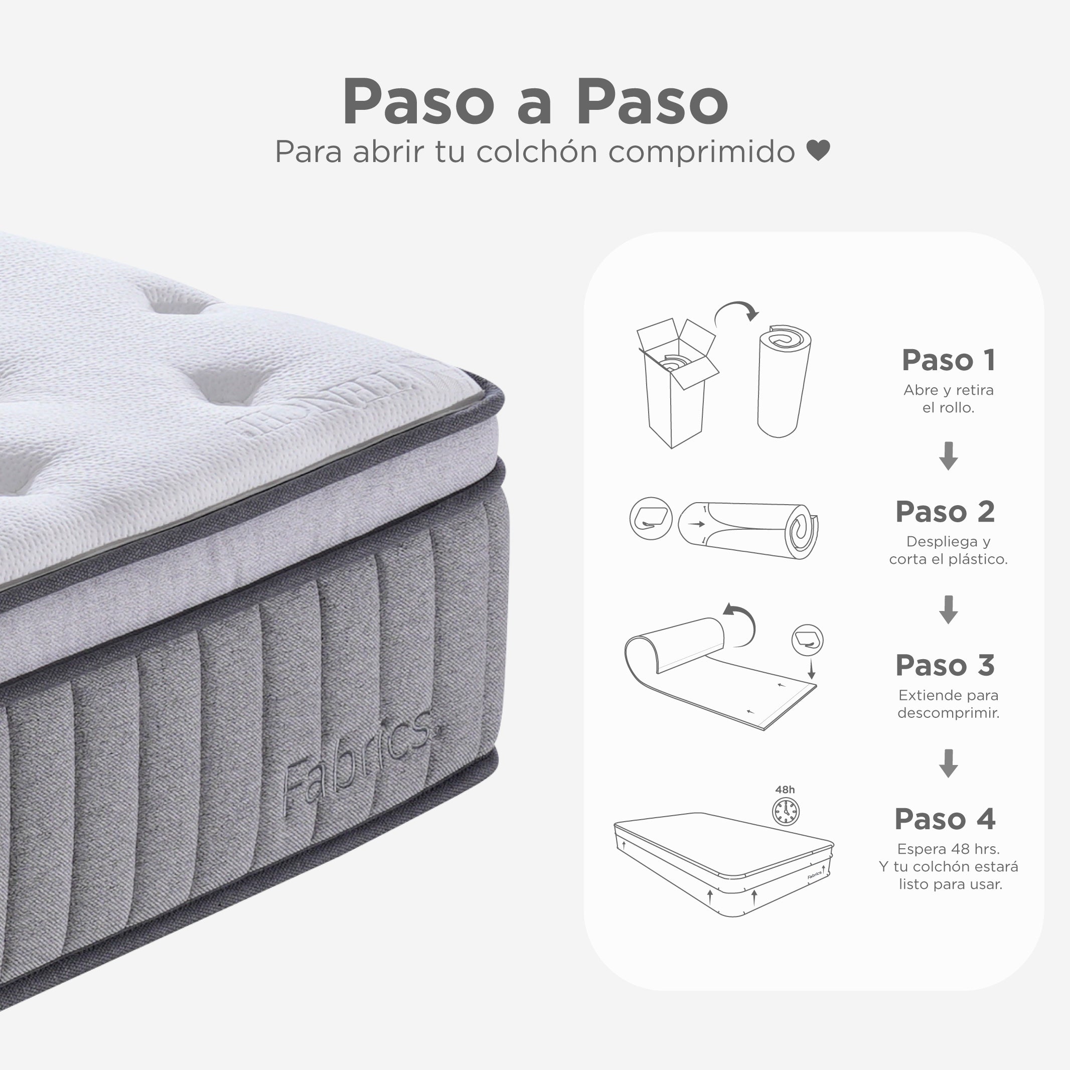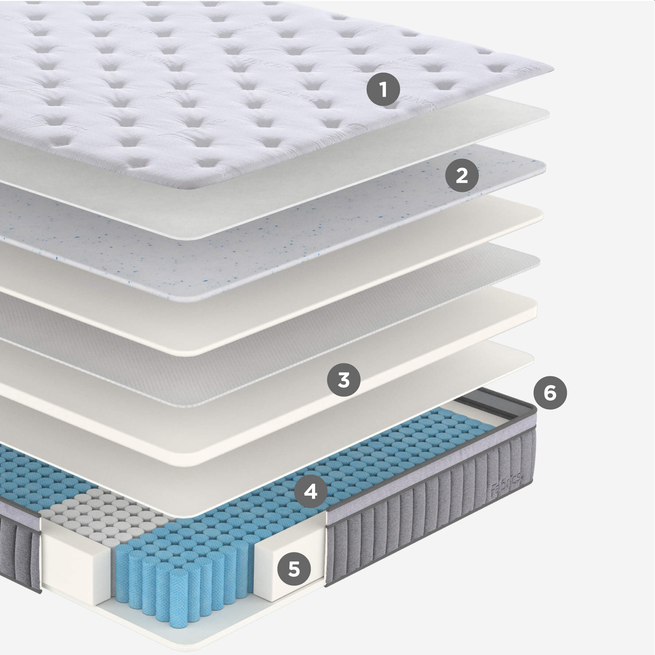 | Estructura interior | Estructura de resortes Pocket 5 zonas, Lámina de Espuma High Resilience, Marco de Espuma. |