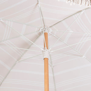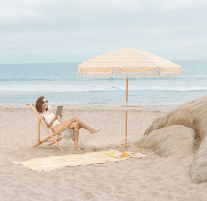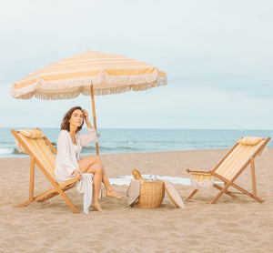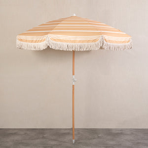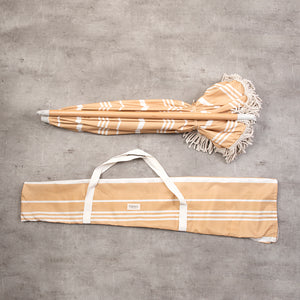 El Quitasol Amalfi Rayas Ocre es perfecto para un día de playa con estilo. Con su bolso contenedor, puede transportarlo fácilmente y con su inclinación regulable, siempre encontrará la sombra perfecta. La punta con hilo le permite perforar la arena y los tassels de algodón agregan un toque de tendencia.